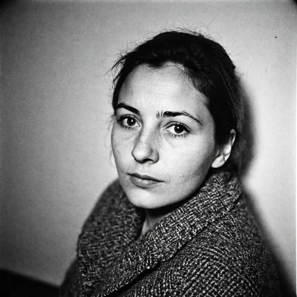 german woman 35 years old sitting in a room in east berlin in 67, watching away , face in shadow, direct flash, high contrast very low light, from side, ilford hp5 analog film, 6x6 camera, artsy, ultra wide angle, contact test, damaged print, faded, light leaks, grainy,blurry, pixelated, motion blur, vignette, scratches on print, damaged scan