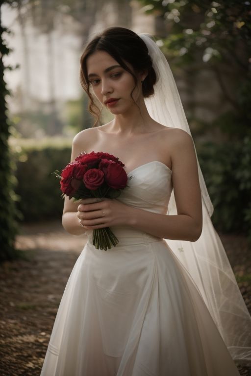 A breathtakingly beautiful woman standing elegantly under the soft, ethereal glow of a moonlit garden. Her bridal attire is a vision of avant-garde couture, a completely transparent wedding dress that leaves nothing to the imagination yet manages to maintain an aura of sophistication and grace. The gossamer gown is adorned with intricate, silver lace embroidery that clings to her silhouette, shimmering in the moonlight like delicate spider webs encrusted with dew-kissed diamonds. The dress flows down to the ground, creating an illusion of her floating on a bed of luminescent petals. Her skin is flawless, with a subtle, natural blush that complements the soft lighting. Her hair, a cascade of dark curls, is loosely styled to frame her face, which is accentuated by a minimal makeup look featuring a bold red lip and smoky eyes that hold an alluring mystery. The bouquet in her hand is a bouquet of phantom roses, translucent and glowing with an inner light, matching the theme of her attire. Her bare shoulders and the delicate straps of the dress expose the sparkling tattoos that trace her collarbones and wrists, adding an edgy yet mesmerizing touch to the otherwise traditional bridal look. The transparency of the dress allows the viewer to appreciate the woman's curves and confidence, as she stands as a symbol of modern beauty and freedom within the timeless tradition of marriage.
