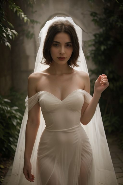 A breathtakingly beautiful woman standing elegantly under the soft, ethereal glow of a moonlit garden. Her bridal attire is a vision of avant-garde couture, a completely transparent wedding dress that leaves nothing to the imagination yet manages to maintain an aura of sophistication and grace. The gossamer gown is adorned with intricate, silver lace embroidery that clings to her silhouette, shimmering in the moonlight like delicate spider webs encrusted with dew-kissed diamonds. The dress flows down to the ground, creating an illusion of her floating on a bed of luminescent petals. Her skin is flawless, with a subtle, natural blush that complements the soft lighting. Her hair, a cascade of dark curls, is loosely styled to frame her face, which is accentuated by a minimal makeup look featuring a bold red lip and smoky eyes that hold an alluring mystery. The bouquet in her hand is a bouquet of phantom roses, translucent and glowing with an inner light, matching the theme of her attire. Her bare shoulders and the delicate straps of the dress expose the sparkling tattoos that trace her collarbones and wrists, adding an edgy yet mesmerizing touch to the otherwise traditional bridal look. The transparency of the dress allows the viewer to appreciate the woman's curves and confidence, as she stands as a symbol of modern beauty and freedom within the timeless tradition of marriage.