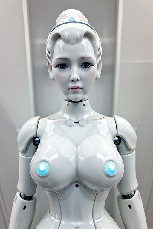 Masterpiece, best quality, White porcelain robot ,White porcelain android, IvoryGoldAI, doll:0.8 , ball joints:0.9, full porcelain body, 38 years old, porcelain face, massive porcelain breasts, porcelain updo hair, blowing kiss, pucker