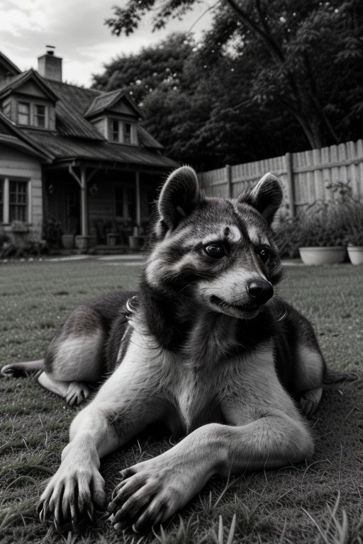 Create a vibrant and vivid image of a small dog lying in a (((lush green grass yard with an old farmhouse in the background.)) The dog should have a black and tan coat, with expressive, large brown eyes. Its ears should be one up and one down, giving it a curious and attentive look. The dog is resting on a bed with gray sheets and a white fabric with pink and black patterns. The setting is indoors, with a cozy and warm ambiance. The dog is a mix of Chihuahua, Rat Terrier, Beagle and Jack Russell Terrier. (((The dog has a black racoon mask. )))He is adorable. professional shoot, high resolution, RAW format, close-up shot, 50mm lens, detailed, highly detailed, macro,(((black and white shot))) EPIC