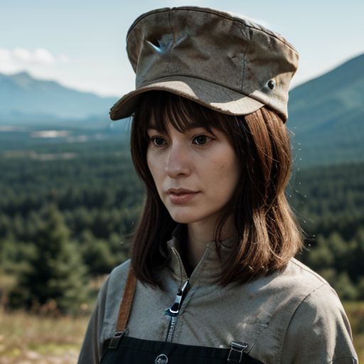 a mountain hounted haired wood, summer-yokai stood hat accent, flat realistic, 4k, strong, ultra dressed, artstation trending, fawncore, painting, ultra wooden, hat and fossil galaxy, order shading through universe