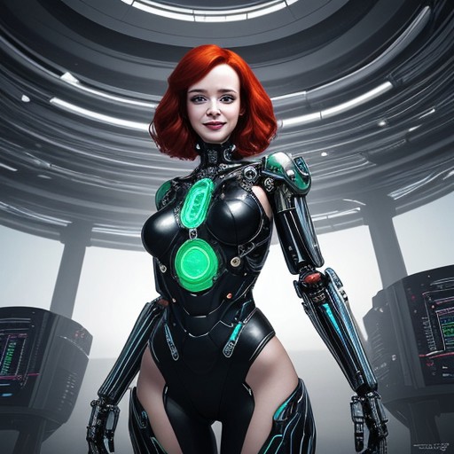 In this rendition, Christina Hendricks emerges as the epitome of futuristic allure, her red locks cascading in waves of fiery elegance. She stands before you, a vision of captivating beauty, but with a cybernetic twist that adds a new dimension to her allure. Christina's left arm has been transformed into a sleek cybernetic limb, seamlessly integrated with her natural form. Adorned with intricate metallic patterns and advanced technology, it exudes a sense of power and sophistication. Embedded within it are hints of advanced weaponry, hinting at the strength and capabilities that lie beneath her glamorous exterior. Her eyes, still a mesmerizing shade of green, now hold a faint cybernetic glow. They pierce through the image with an enhanced intensity, hinting at a depth of perception far beyond human limits. Despite these enhancements, Christina's smile remains as enchanting as ever, drawing you in with its radiant warmth. It's a smile that speaks of confidence and allure, transcending the boundaries of time and technology. The background sets the stage for this futuristic vision, with towering metallic structures soaring into the sky. Advanced technology hums in the air, hinting at a world where innovation and beauty intertwine seamlessly. This masterpiece captures the essence of Christina Hendricks' iconic beauty, blending it with the allure of futuristic cybernetics.