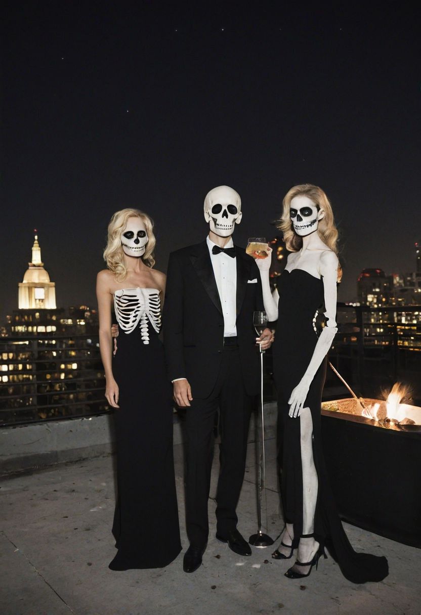 skeletons at a rooftop cocktail party in black tie and cocktail dresses, and sexy beautiful women,
