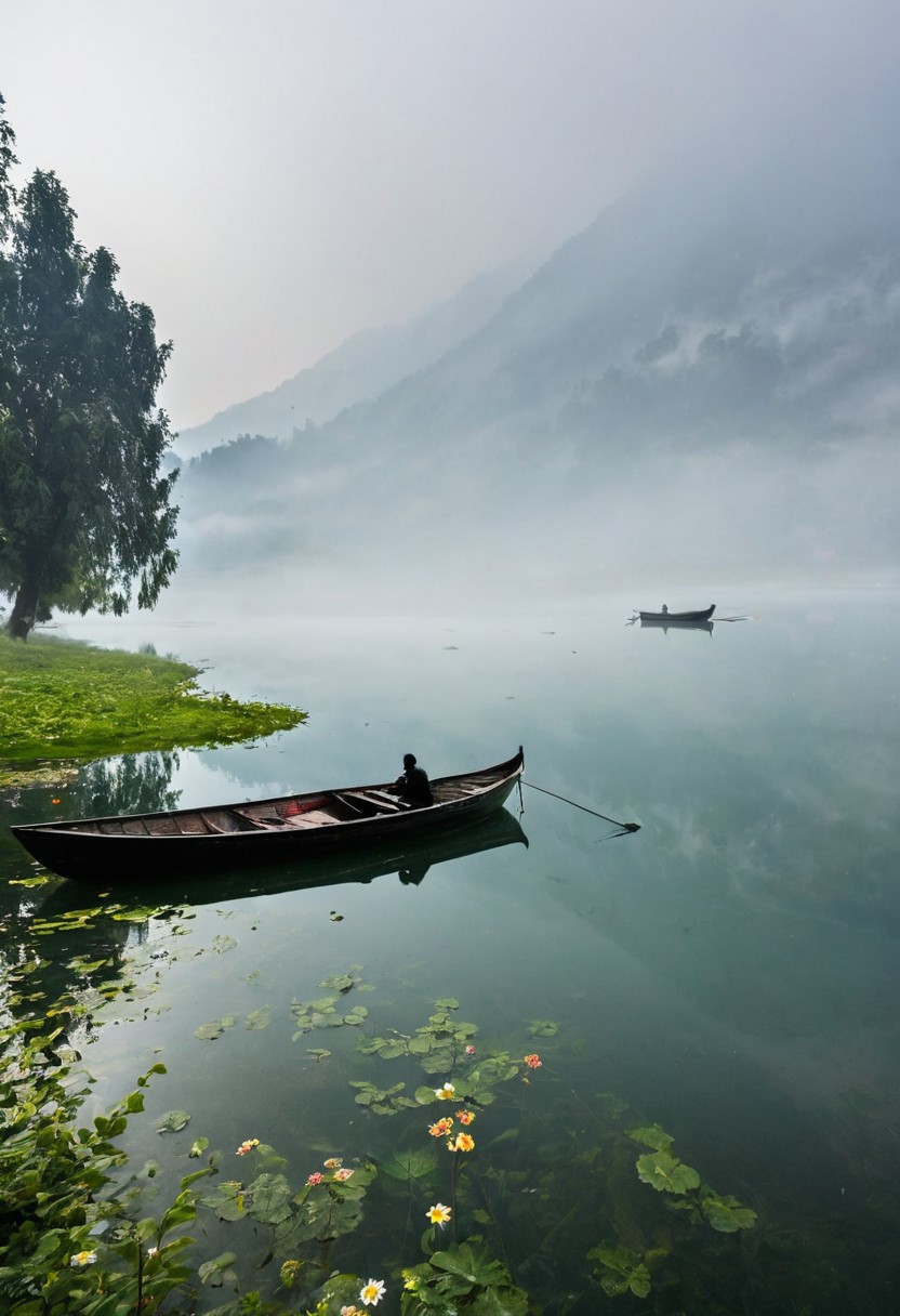 A haunted landscape, fog, INDIA, Kashmir, flower of valley, striking details of trees, lake and mirror reflection. wide angle shot, a fisherman boat into the mist, silhouette boat, small boat.