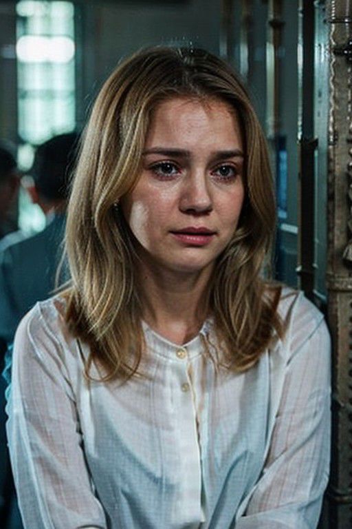 Mid Shot, Cute Mid Twenties Woman sentenced to prison, looking down, crying, Transparent Liquid, nervous, Saphire eyes, (medium blonde hair), wearing ((a white long sleeve Blouse and Blue Jeans Clothes)), Deep photo, depth of field, ((Prison Cell Background))