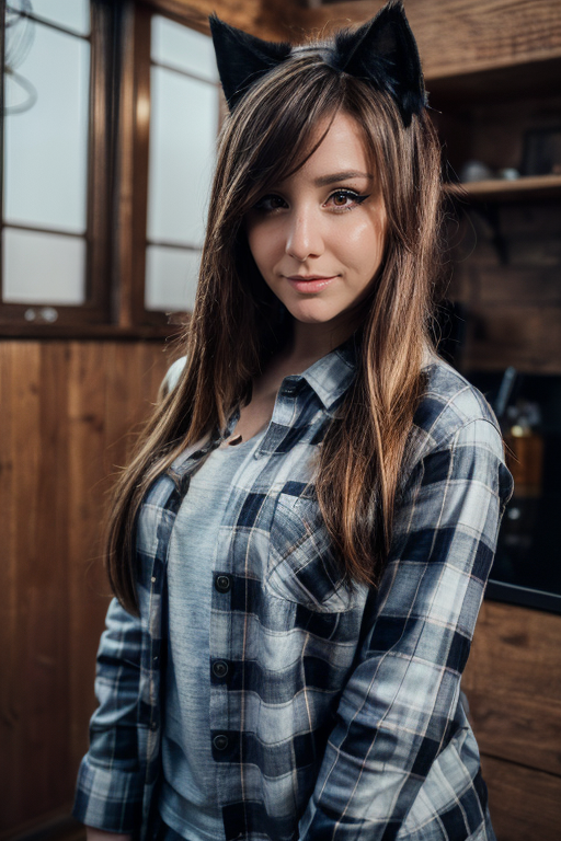 woman,<lora:MSRG:0.8> missrage, (masterpiece:1.4, best quality), (intricate details), unity 8k wallpaper, ultra detailed, hyper realistic, detailed skin, Plaid flannel button-up shirt with a frayed hem., <lora:add_detail:1> <lora:age_slider_v20:-2>, <lora:catgirl:0.4> <lora:catgirl2:0.4> catgirl cat ears