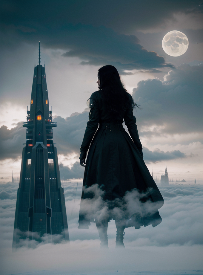 1 girl, skull head, reA stunning futuristic city floating in the clouds. Glass towers with spires floating in the sky. Sci-fi vibes. Flying spaceships in the clouds. Futuristic. Solarpunk. Surrounded by fluffy clouds. intricate details, beautifully shot, perfect composition, high contrast, cinematic, atmospheric, moodyalistic, colorful hair, fantasy dress, black_hair, utdoors, sky, cloud,moon, scenery, fantasy, In a desolate, shadowy wasteland, a lone figure trudged through the ashen landscape, the air heavy with an ominous silence., scene view, dynamic angle, <lora:style-1-v4-200:0.6>,bailing_eastern ,snow,outdoors,red eyes,long hair,snowing,from behind,