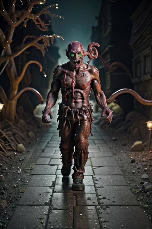 zombie creature, walking the streets, extreme detail, realism, horror, cinematic effect, night scene, 4k wallpaper, ultra quality, veins, flesh, blood, slime, heart, closeup, melt, scary