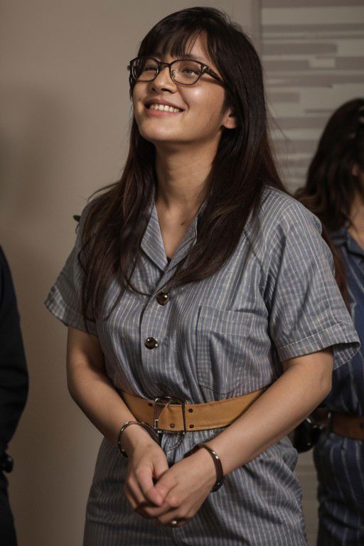 Cute Asian Teen Girl, rectangle glasses, looking up, ((smile)), medium hair with bangs, ((Striped Prison Jumpsuit clothes)), Transport Belt, handcuffs, Deep photo, depth of field, dark photo, ((Courtroom background))