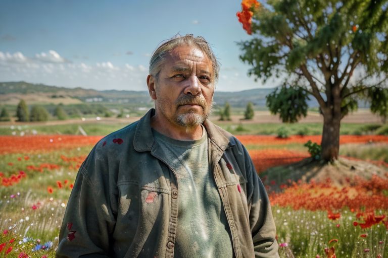 Capture a moment of raw reality: a middle-aged man, weathered by life's experiences, standing alone on a hill under the shade of a sprawling tree in a vibrant poppy field. The harsh sunlight casts subtle shadows on his worn face, emphasizing the lines etched by time. His clothing, practical and worn, reflects a life lived. The poppies sway gently in the breeze, their vivid red petals contrasting with the muted tones of the landscape. The man's expression is a nuanced blend of contemplation and quiet strength, a reflection of the resilience earned through years of challenges. Ensure that every detail is unfiltered and authentic, immersing the viewer in the unembellished beauty of this ordinary yet extraordinary moment.