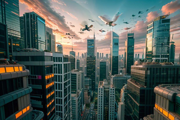 hundreds of weightless humans floating into the sky, High-rise Buildings under a vibrant sunset sky amidst a futuristic cityscape, panoramic cityscape, vibrant and dynamic lighting, flying vehicles weaving through skyscrapers, and intricate alleyways.