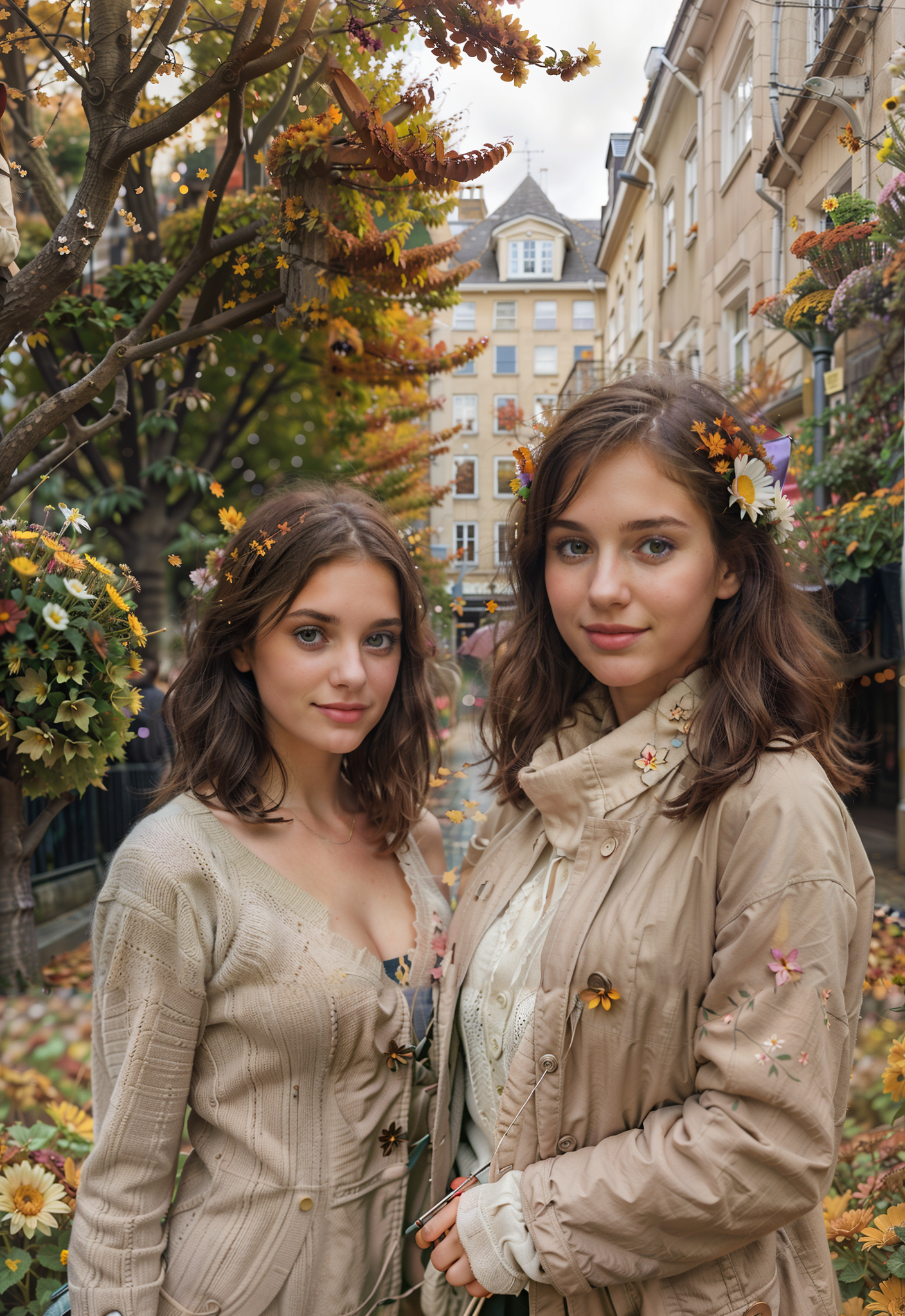 beautiful girl in street with umbrella, (autumn), flowers<lora:epiCRealismHelper:0.8>
