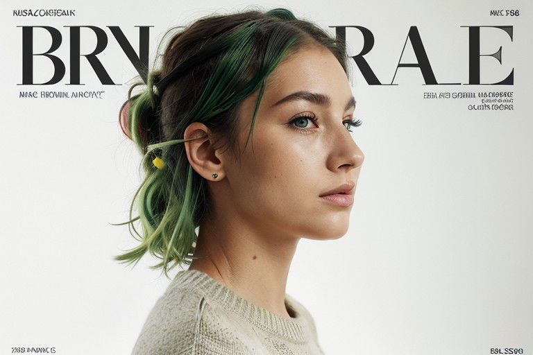 high-resolution pen-and-ink drawing magazine cover of a female face, in three-quarters profile, a tan european woman with hooked nose, dirty green hair, green eyes, dark eyebrows, square face, plain bright white background, flat bright lighting, Wearing a black sweater.
