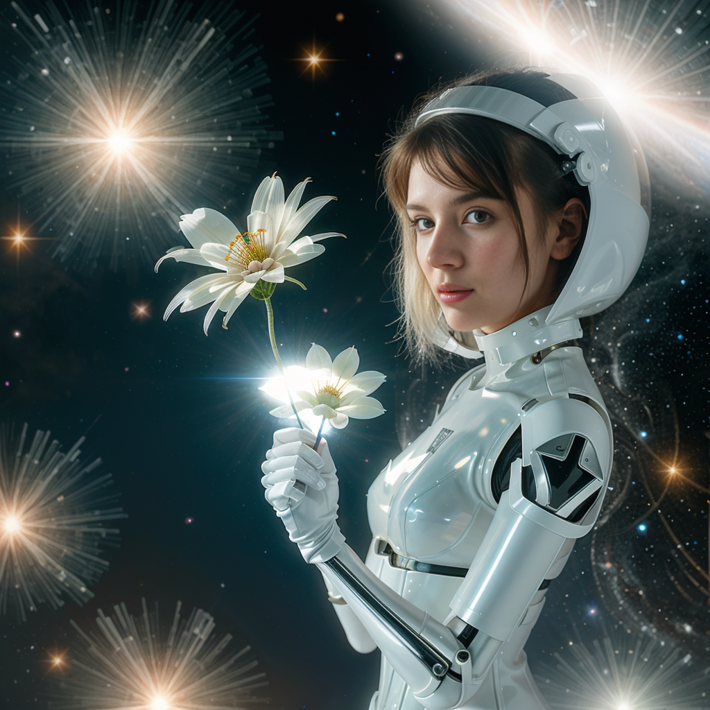 a futuristic cyborg girl in white plastic and metal armor holding a delicate flower in her hands against the backdrop of a breathtaking galaxy in the spaceship <lora:epiCRealismHelper:0.8>