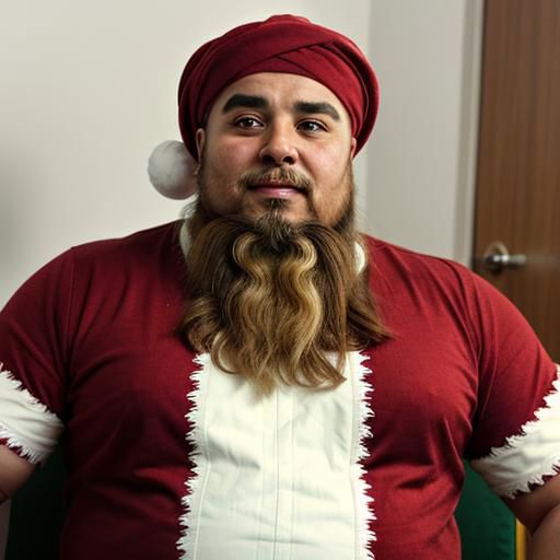 Beefy, stocky, bearded, Islamic-turbaned wear, Santa Claus in islamic people meeting