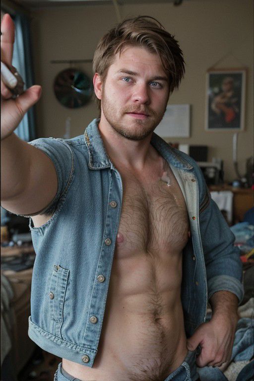 hyper realistic candid photo of a 24yo redneck male, average, (looking at camera:1.3), messy room, analog style, masterpiece, pubic hair, winking, short hair, slightly hairy chest, denim jacket, selfie, bulge