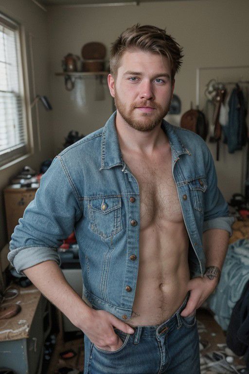 hyper realistic candid photo of a 24yo redneck male, average, (looking at camera:1.3), messy room, analog style, masterpiece, pubic hair, winking, short hair, slightly hairy chest, denim jacket, selfie