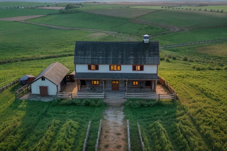 top view, wide farmstead with a large main home with a barn to one side , translucent, high quality photography, 3 point lighting, flash with softbox, 4k, Canon EOS R3, hdr, smooth, sharp focus, high resolution, award winning photo, 80mm, f2.8, bokeh, undefined