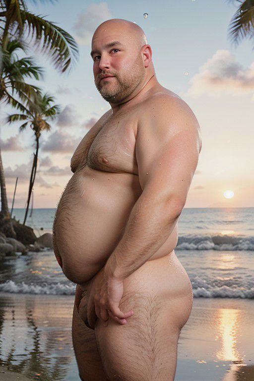 chubby beefy , 48 yo man, long bearded, bald, blonde fluffy hair with pink highlights, chubby face, backside, bubble muscled butt, long beach, wet, sunset, palm trees, bokeh, chubby face, soft shading, faint smile, reflection, light particles, looking at viewer, round eyes