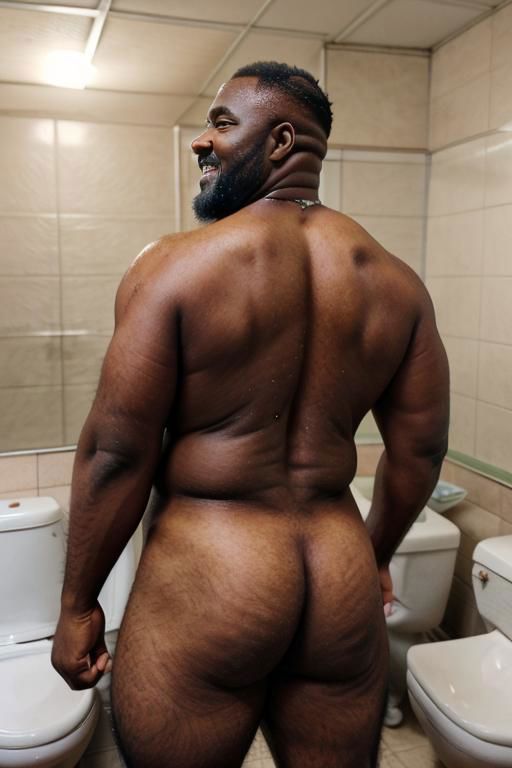 65 years old, mature, daddy, gray beard, fat face, somalian, black man, long bearded, chubby, fat, from back to left, in public toilet, looking at the viewer, smiling