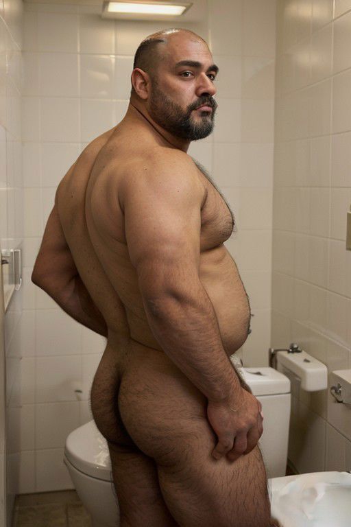 masterpiece, grizzly, 55-years-old, bald, mature, gray long beard, handsome, chubby, stocky, persian, muslim man, massive hairy beefy body, in the public toilet, nude, looking at viewer, realistic small muscled butts, from left to back side, smile