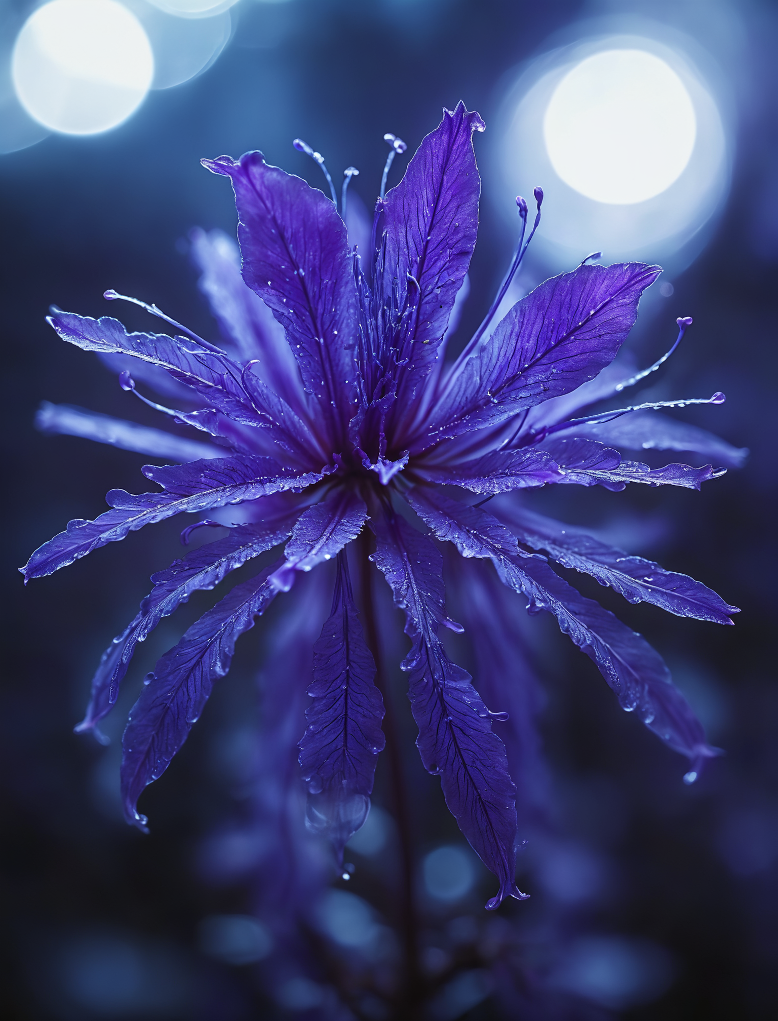 epiCPhoto, Alien plant life, a vibrant purple blossom with elongated petals, softly illuminated by the moonlight, intricate vein patterns, gentle breeze causing subtle movement, high resolution, dreamy bokeh effect