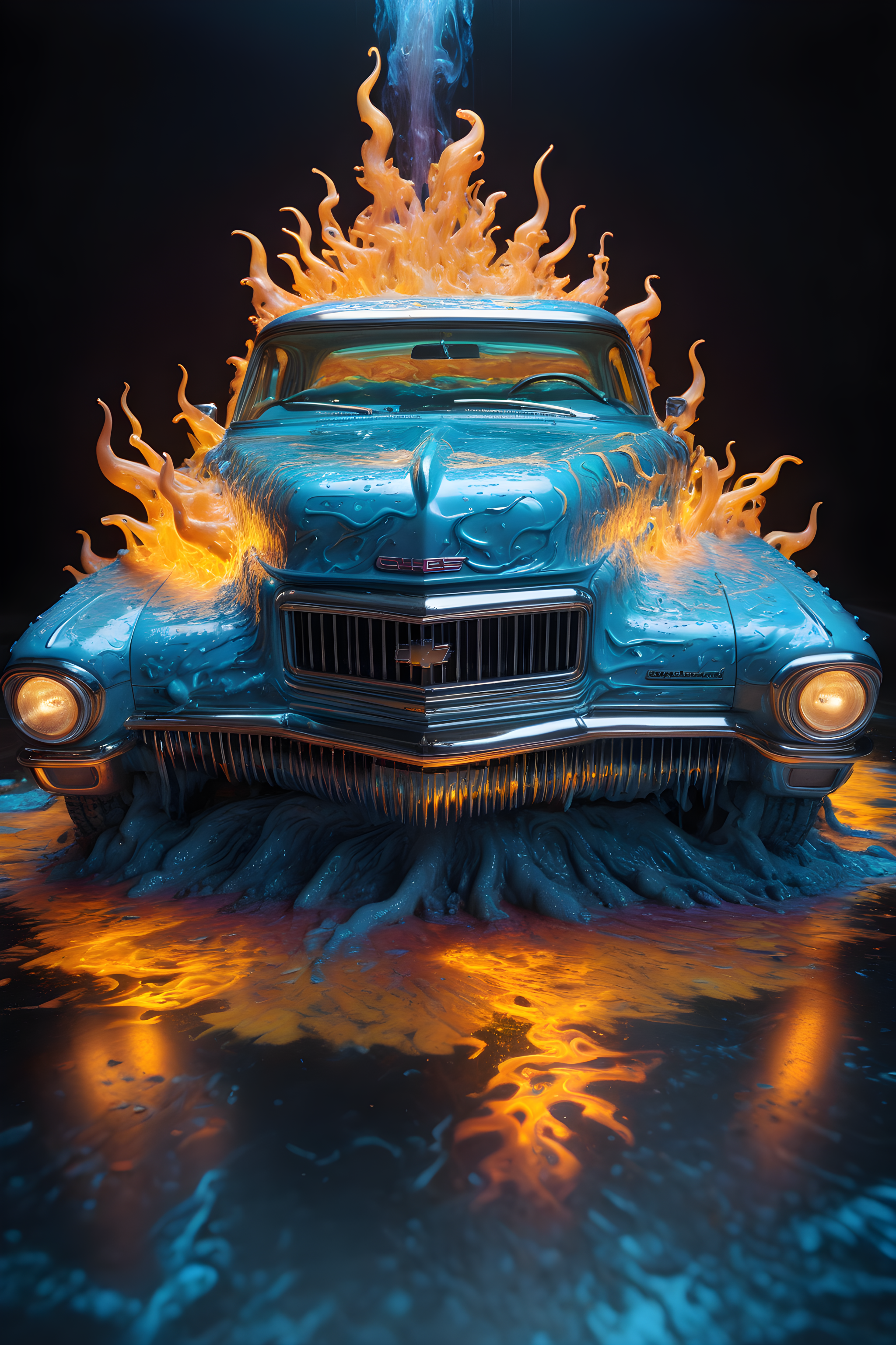 Blue chevy el camino melting , like melted cheese, organic growth, colorful, luminism, bioluminescence, studio lighting, hyper detailed, (masterpiece, best quality:1.4), (ultra realistic:1.2), 4k, high-detailed, 8k, Aura, Glow, reflection, refraction, diffuse light, detailed texture, intricate detail, vibrant color, ornate, intricate detail, prespective, eyes, mouth, monster, spirits, flames, smoke <lora:artfullyNETHERMAGE-000015:0.2> <lora:SDXLFaeTastic2400:0.2> <lora:evil_villain:0.2> <lora:absolutely_terrified:0.2> <lora:Bio-Luminescence:0.2> <lora:dare_gorgeous_trip_monster:0.2> <lora:SDXLHighDetail_v5:0.2> <lora:FF-Style-Dall-e-FFusion-Surrealism:0.2>