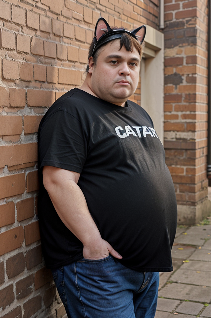 hyper realistic, a fat middle-aged man, (cat ears:1.2), wearing a black t-shirt and orange jeans, a red brick wall in the background<lora:weight_slider_v2:2>