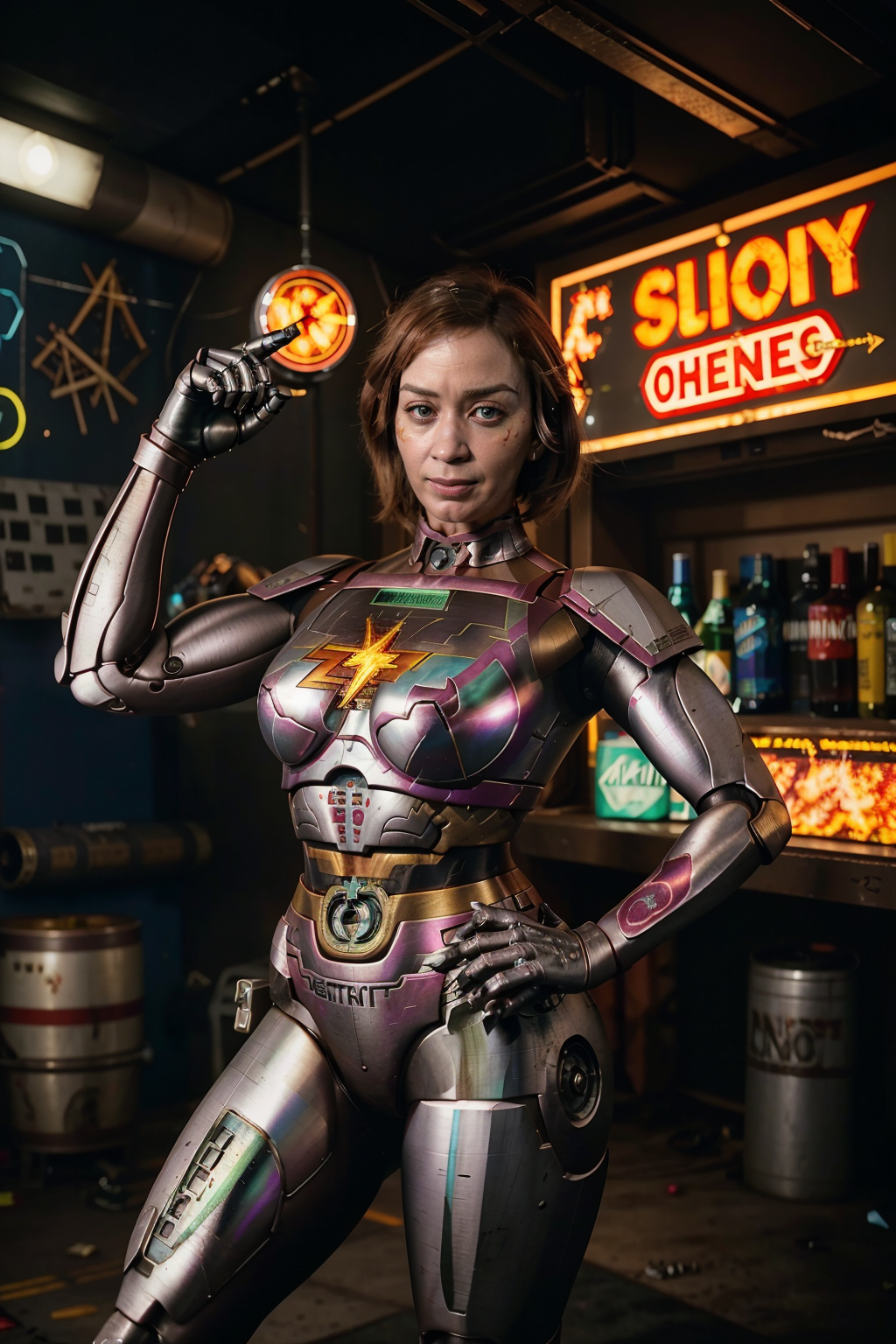 realistic, cinematic photo, ((Emily Blunt)) as cyberpunk JaspionQuiron character, with rusty and damage cybernetic arm, (cyberpunk style), dynamic posture , neon light, trending art, trending on artstation, Dappled Light, analog style, cinematic light, side lighting, best shadow, (SteelHeartQuiron character, Sorayama Style, metallic chrome), explosion, fire, electricity, lightning, rampage, <lora:quiron_Jaspion_v1_Lora:0.77>,<lora:quiron_SteelHeart_V1_Lora:0.48>