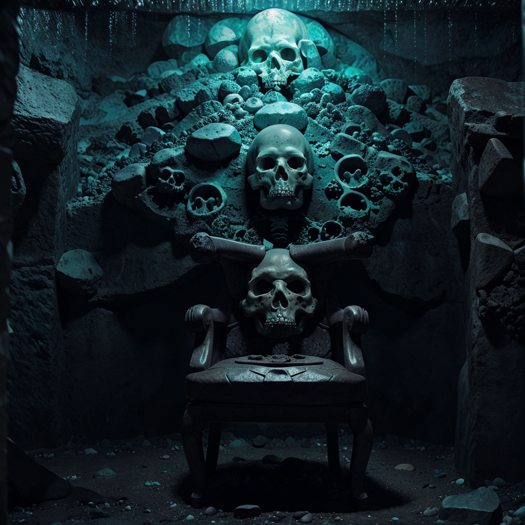 in front of an creepy aqua frosted mirrorpanel seeing through it (catacombs very dark ) rumble, ossuary, there is a chair made of human bones with no head, floor is made of rock (darkness),