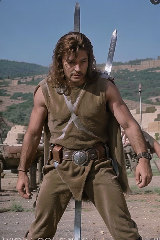 ASCII(High resolution, high quality), tarkan, movie character, hold sword, 70s movies style, (with the wolf), epic sword fight scene, ((he fighting crusaders soldiers)), dynamic pose,