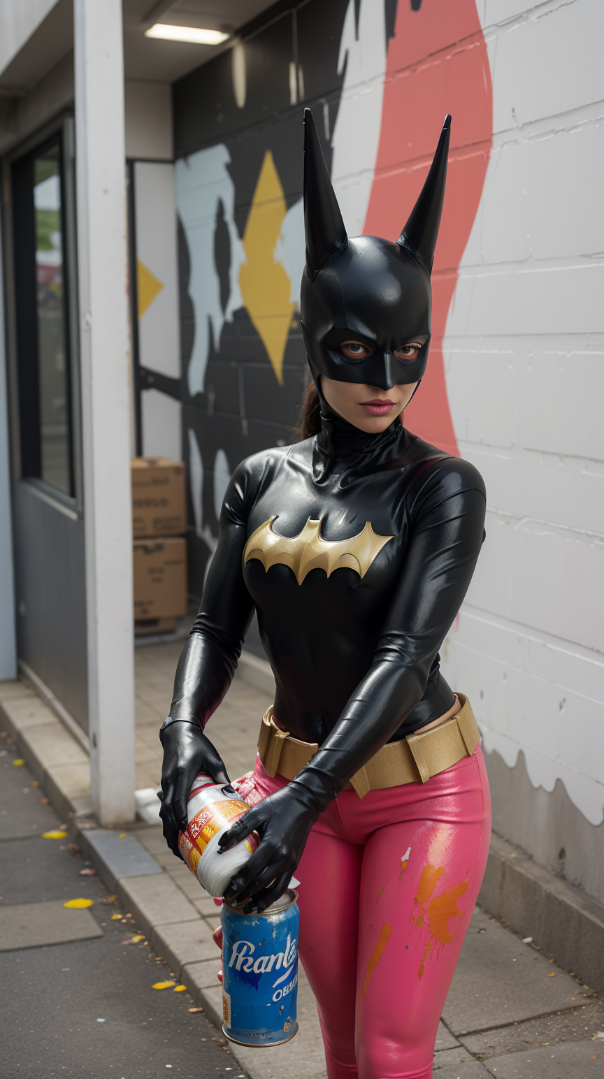 plastic, shiny, (reflective:0.6), <lora:BatmanCore:__05_07__> BatmanCore a female artist creating an inspiring street mural with cans of paint, black, <lora:BarbieCore:0.9> BarbieCore a female artist creating an inspiring street mural with cans of paint, pink, colorful, saturated, (Masterpiece:1.3) (best quality:1.2) (high quality:1.1)