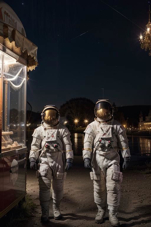 ((astronauts with their helmets on)) at a park small night fair, fair stails, christmas lights, , night, a castle and a lake background, professional photography, dramatic light, RAW quality, uhd,