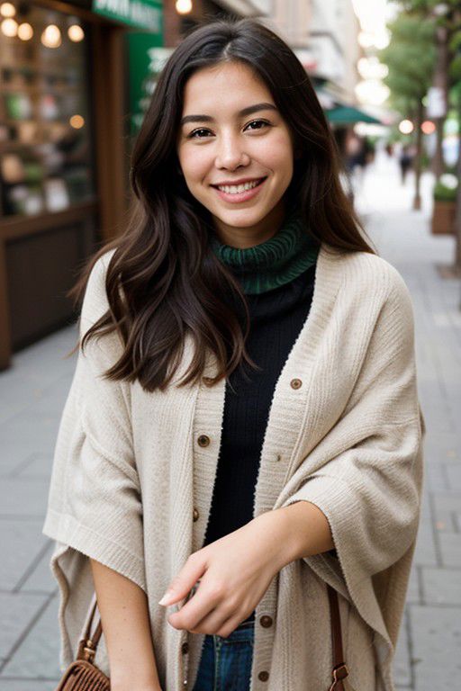 Random portrait of a woman, natural colors, happy, smiling, wearing a poncho, starbucks,