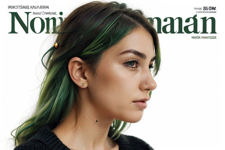 high-resolution pen-and-ink drawing magazine cover of a female face, in three-quarters profile, a tan european woman with hooked nose, dirty green hair, green eyes, dark eyebrows, square face, plain bright white background, flat bright lighting, Wearing a black sweater.