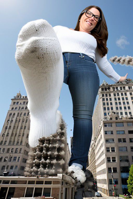 Massive socked giantess woman, massive socked woman standing over city, walking over building, stepping over building, stepping onto building, building is breaking under socked sole, stepping toward camera, stepping over camera, stepping over viewed, low angle, raised foot, looking up at woman, young woman, thick woman, sexy thick woman, crushing city, pale skin, white skin, freckles, walking in city, freckles on face, walking over buildings, socked foot crashing through building, socked foot coming towards camera, socks, thick white socks, presenting sock to viewer, dirty white socks, sock stomp, outside, stomp viewer, sexy thicc, stocky woman, stocky build, chubby, white top, dimples, smile, dimple smile, jeans, glasses, symmetrical face, destroyed building, sock destroying building, clean photo face, white shirt, white top, perfect face, clean face, stepping on viewer, stepping over building and stepping on viewer, short legs, standing, woman standing, walking forward, socked foot resting on building, looming over building, camera is looking straight up, woman looking straight down to camera, worms eye view, socked sole hitting building, stepping onto building above viewer, (dirty feet:1.1), (dirty socks:1.2), feet focus gloom, particle effects <lora:Really_dirty_socks_Lora_and_feet:0.7>