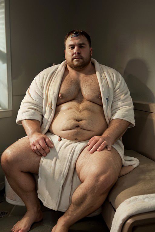 a photo of a large chubby man,(bathrobe:1.3),naked,sitting on a sofa,full body,slippers, bald, blonde, ((hairy chest)), ((wide shoulders, large pectorals)),pubic hair,hairy legs, in public bathroom, deep shadows,cinematic lighting,dark,detailed background,