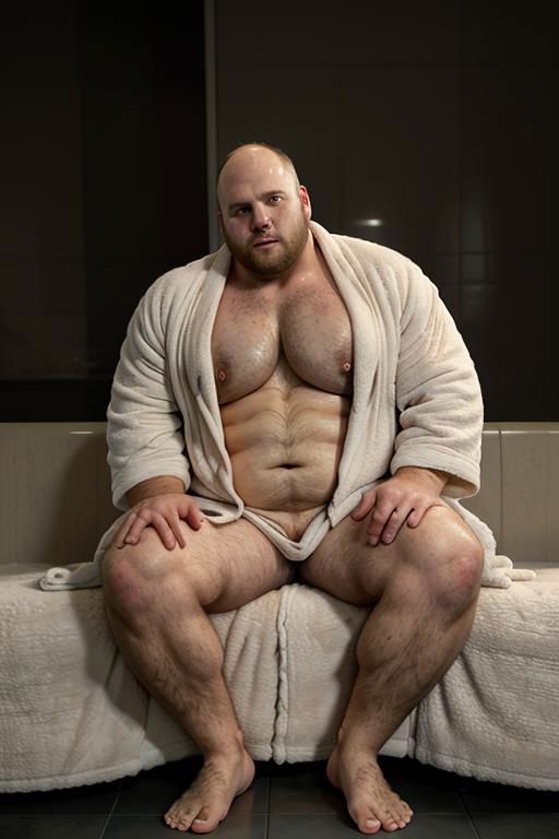 a photo of a large chubby man,(bathrobe:1.3),naked,sitting on a sofa,full body,slippers, bald, blonde, ((hairy chest)), ((wide shoulders, large pectorals)),pubic hair,hairy legs, in public bathroom, deep shadows,cinematic lighting,dark,detailed background,