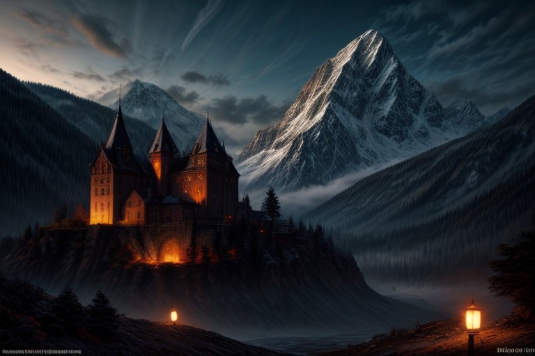 Medieval German castle, surrounded by mountains, high fantasy, epic, digital art.