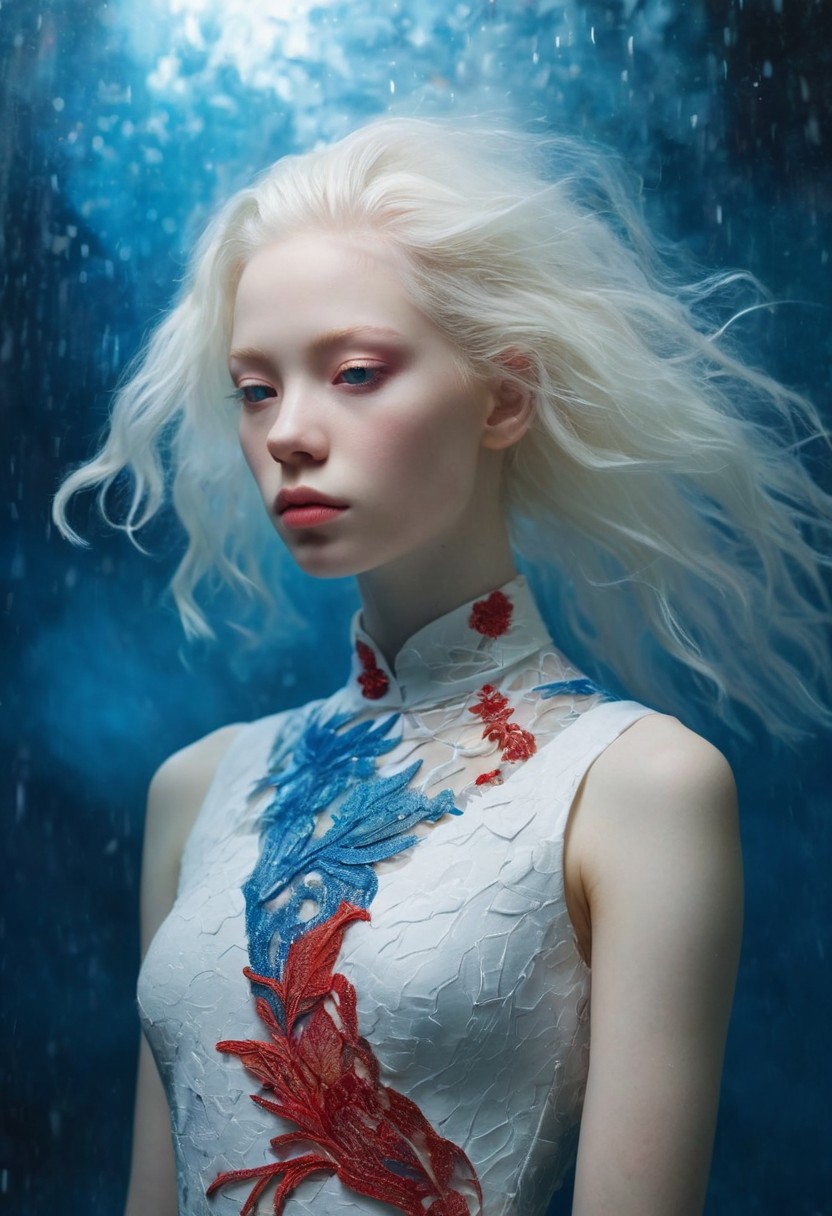 layered papercut, mysterious face, an exotic woman in artsy clothing, fading backlit background, (deep sea fading white to deep blue/red), alluring goddess, by Minjae Lee, Carne Griffiths, Emily Kell, Steve McCurry, Geoffroy Thoorens, Aaron Horkey, Jordan Grimmer, Greg Rutkowski, amazing depth, double exposure, Interrex - Escape <lora:detailed_notrigger:0.8> <lora:M05_Intensify:0.8> <lora:glowneon_xl_v1:0.8> glowneon, glowing, sparks, lightning <lora:SDXLFaeTastic2400:0.8> (Glamour:1.3) photo of a 20yo, (strikingly beautiful:1.2) vivacious, enigmatic, ethereal, (albino:1.3) (nymph:1.3), (albinism:1.4), Lengthened Rectangular Face with Noticeable Jaw and Cheekbones, Clean, Straight Eyebrows, Wide-Set Close-Set Eyes, Majestic Aquiline Nose, Full Lips, windswept (Fine) (stylish short white hair:1.3), (looking at viewer),(Ashen skin:1.3), (flawless skin:1.3), (shiny skin), diaphanous white dress, high neckline on dress, (foggy:1.4), (bathed in thick fog:1.4), (half-obscured:1.3), (Close up:1.2), Dutch Angle), (dynamic composition:1.2), (shallow depth of field:1.2), bright lighting vibrant, in the style of (Ansel Adams:1.3) (Rule of thirds:1.1) Show less