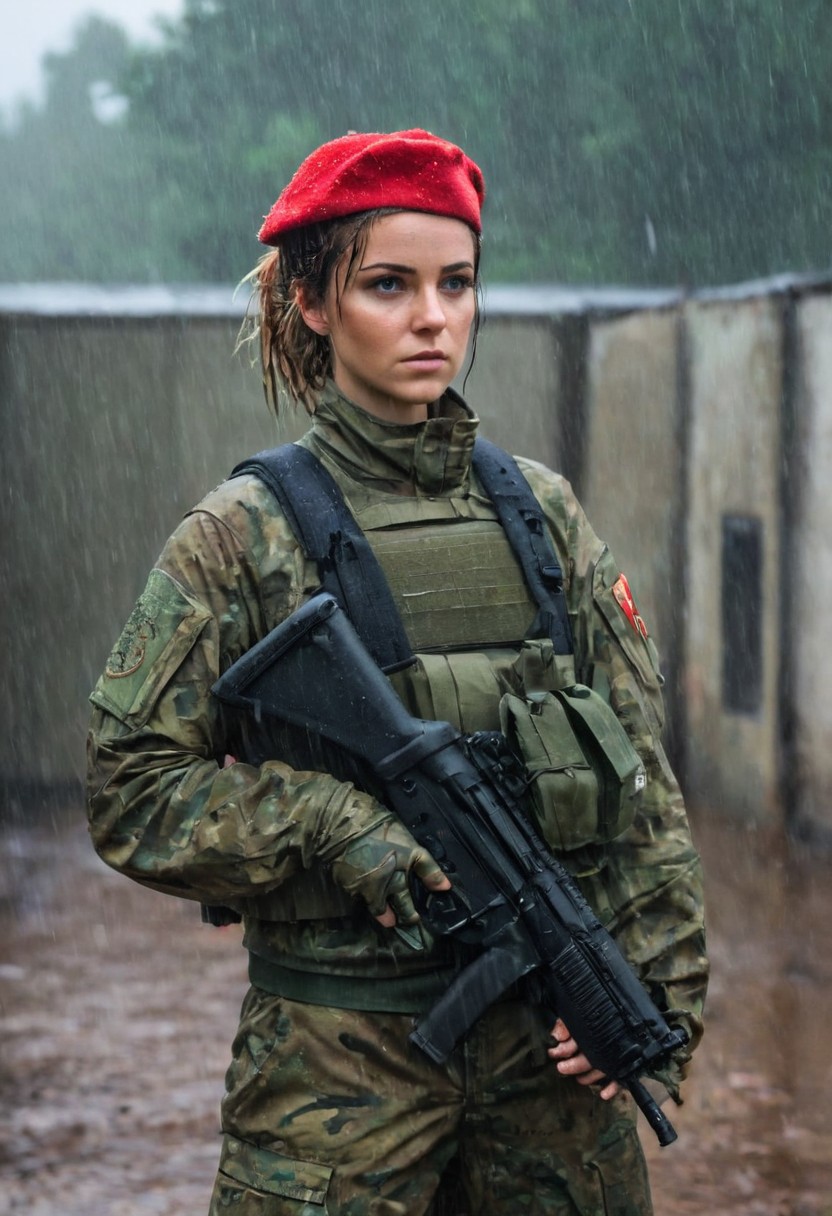 French, french badge, female soldier, messy bun, mp5, camo military fatigues, red military beret, outdoors, barracks, serious gaze, heavy rain, wet clothes, wet hair, backpack