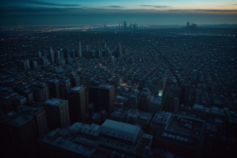 An aerial view of an Edward Hopper-style photograph of a city skyline