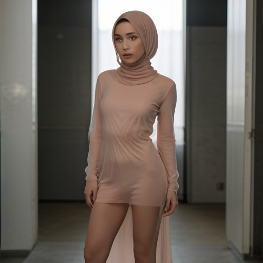 A hijabi woman wearing a semi-transparent long dress, her sexy legs are revealed through her transparent outfit
