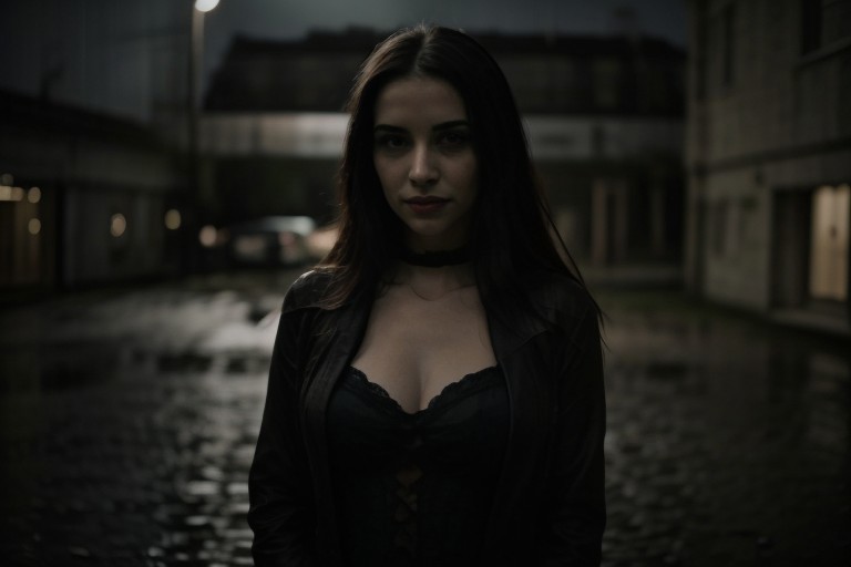 pitch black background and room, photorealistic, best quality, stunning lovely gothic lady, standing outside in the darkness and the rain, satisfiedc smile
