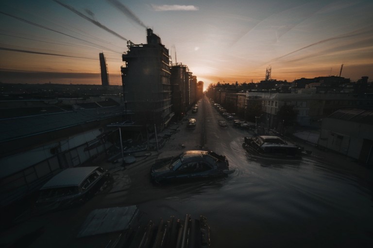 cityscape, post-apocalyptic San Francisco, sunset, destroyed buildings, ruined cars, flooded streets, smoke trails from fires