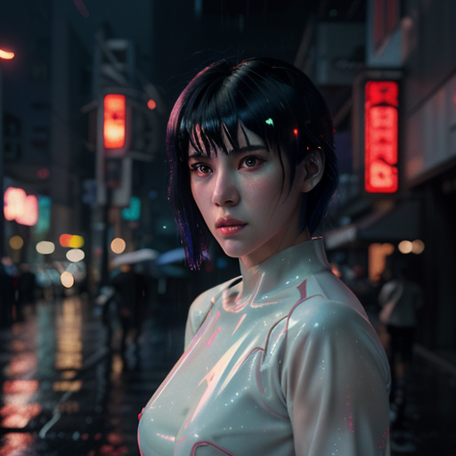 Anime art of ghost in the Shell, detailed scene, red, perfect face, intricately detailed photorealism, trending on artstation, neon lights, rainy day, ray-traced environment, vintage 90's anime artwork.