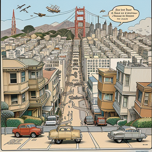 chaotic stunning San Francisco, illustrated by Hergé, style of tin tin comics, pen and ink,retro-futuristic