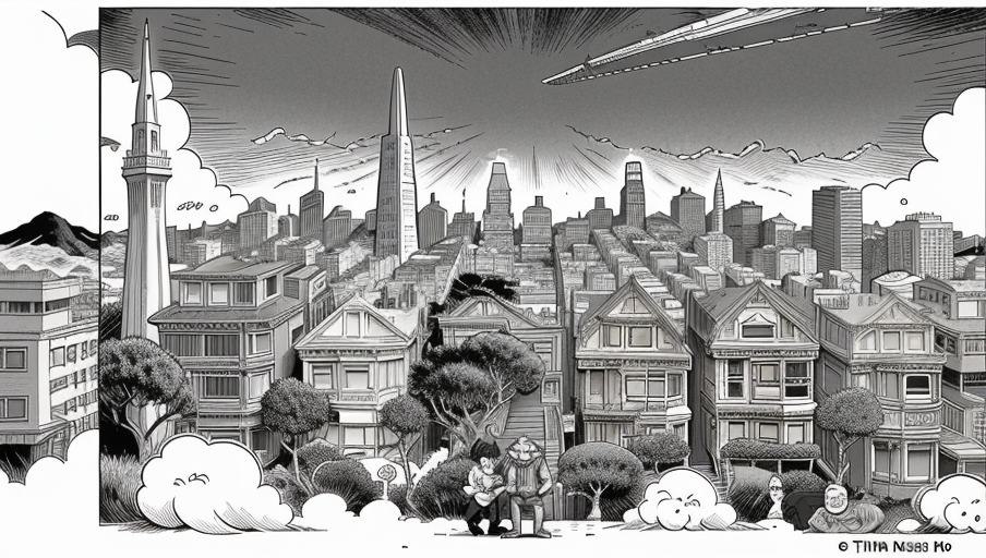 chaotic stunning San Francisco, (style of tin tin comics), pen and ink,retro-futuristic