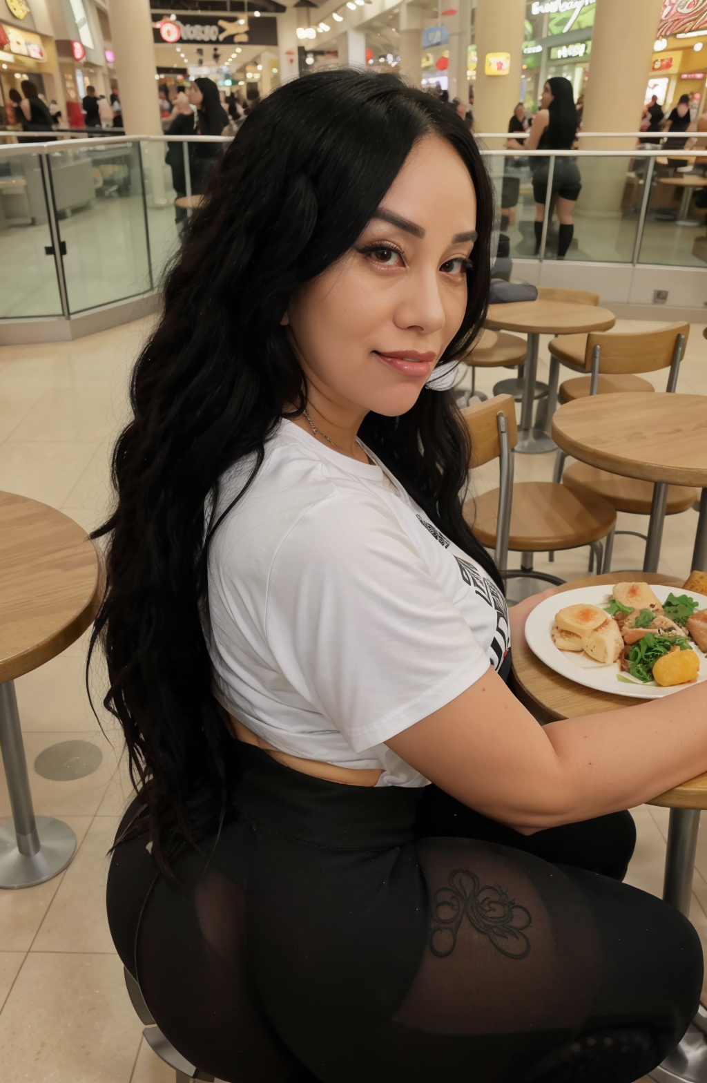 8K, HDR, Queen Rogue, masterpiece, best quality, 1girl, smile, black eyes, looking at viewer, black hair, closed mouth, long hair, background: mall interior with crowded food court ,solo, upper body, wearing an anime tshirt and leggings, <lora:Queen Rogue-000006:1>
